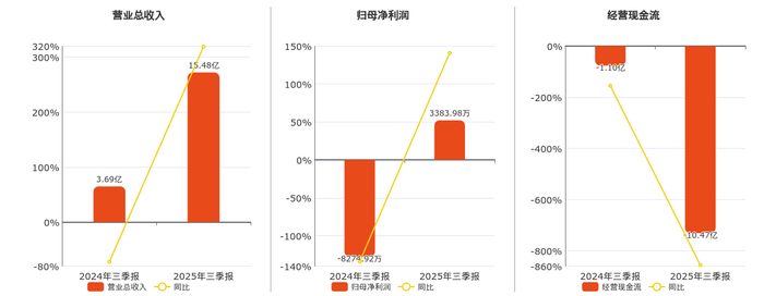 公司营业总收入为15.48亿元,在已披露的同业公司中排名第18,较去年同报告期营业总收入增加11.78亿元,同比较去年同期上涨319.01%。归母净利润为3383.98万元,较去年同报告期归母净利润增加1.17亿元。经营活动现金净流入为-10.47亿元。
