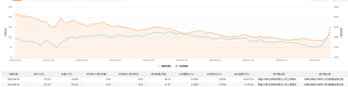 9月30日大宗交易成交131.21万股,成交额1.61亿元,占当日总成交额的22.51%,成交价123.02元,较市场收盘价126.84元折价3.01%。