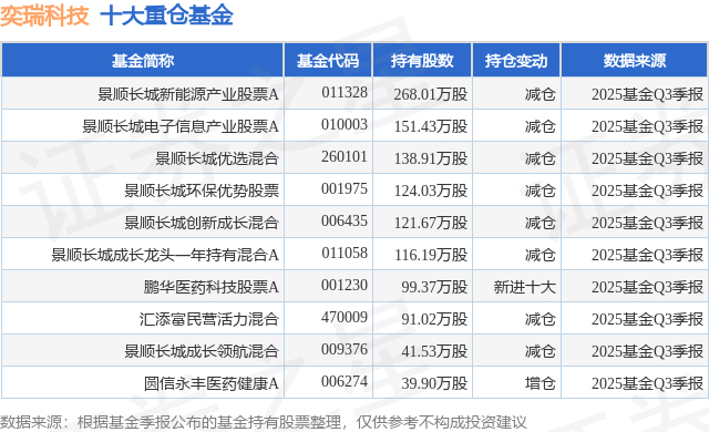 根据2025基金Q3季报公募基金重仓股数据,重仓该股的公募基金共53家,其中持有数量最多的公募基金为景顺长城基金的景顺长城新能源产业股票A。景顺长城新能源产业股票A目前规模为24.68亿元,最新净值1.3477(12月18日),较上一交易日下跌0.59%,近一年上涨23.53%。该公募基金现任基金经理为杨锐文 曾英捷。杨锐文在任的基金产品包括:景顺长城优选混合,管理时间为2014年10月25日至今,期间收益率为312.98%;景顺长城环保优势股票,管理时间为2016年3月15日至今,期间收益率为286.2%;景顺长城创新成长混合,管理时间为2019年10月17日至今,期间收益率为89.9%;景顺长城成长领航混合,管理时间为2020年5月28日至今,期间收益率为59.24%。曾英捷在任的基金产品包括:景顺长城精锐成长混合A,管理时间为2025年11月21日至今,期间收益率为10.35%。