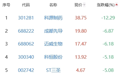 科源制药、成都先导、迈威生物、科恒股份、ST三圣位列涨幅榜后五位,涨幅分别为-12.29%、-6.87%、-6.18%、-5.18%、-5.08%。