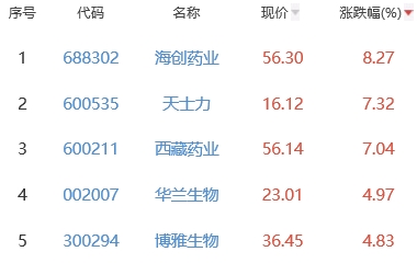 其中,海创药业、天士力、西藏药业、华兰生物、博雅生物位列板块涨幅前五位,涨幅分别为8.27%、7.32%、7.04%、4.97%、4.83%。