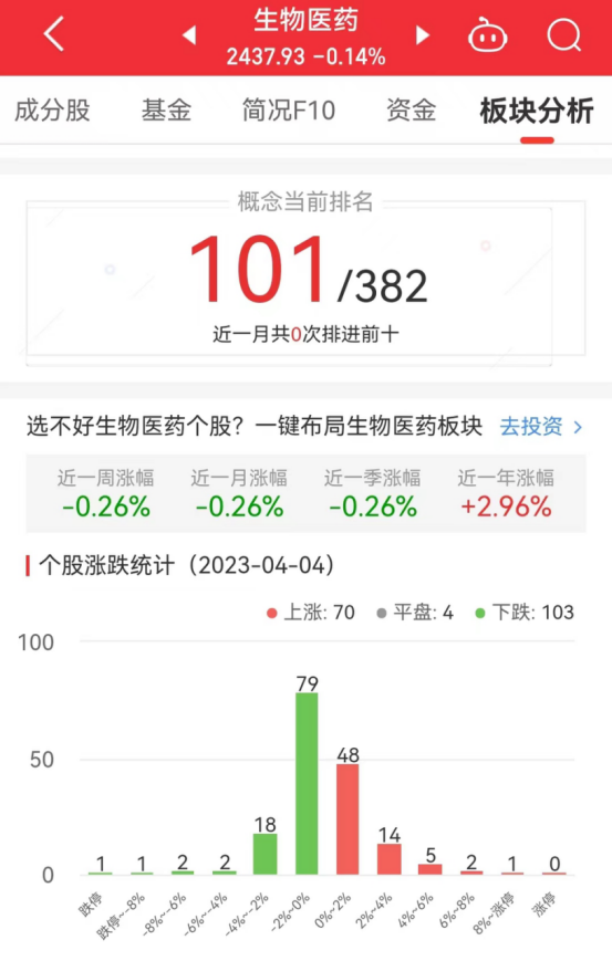 中国经济网北京4月4日讯今日,生物医药板块整体涨幅-0.14%,其中70只股票上涨,4只股票平盘,103只股票下跌。