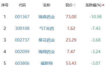 海森药业、*ST吉药、葵花药业、海翔药业、福斯特位列涨幅榜后五位,涨幅分别为-10.98%、-7.43%、-3.68%、-3.24%、-3.07%。