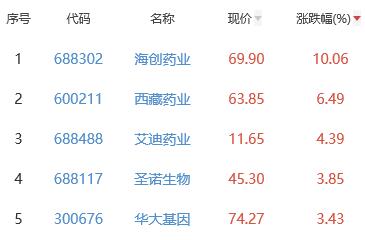 其中,海创药业、西藏药业、艾迪药业、圣诺生物、华大基因位列板块涨幅前五位,涨幅分别为10.06%、6.49%、4.39%、3.85%、3.43%。