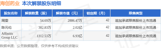 证券之星消息,根据市场公开信息整理,海创药业(688302)于10月13日将有1750.05万股限售股份解禁,为公司追加承诺限售股份上市流通,占公司总股本17.67%。(本次数据根据历史公告整理得出,实际情况以上市公司最新公告为准)最近一年内,该股累计解禁879.07万股,占总股本的8.88%。本次解禁后,公司已无限售股份。具体如下图所示: