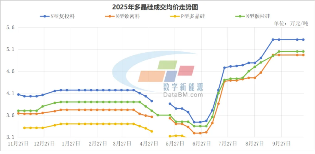 其中硅料价格的回升最为明显。根据数字新能源DataBM.com统计,当前,各品类硅料成交均价相比年初至少上涨了30%。
