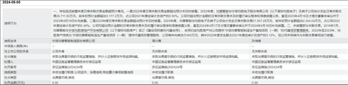 2024年8月,宁波证监局出具警示函,指出公司2022年、2023年与均胜电子及其子公司的日常关联交易金额,分别超出年初预计3177.2万元、2344.04万元,但公司未及时履行审议程序与信息披露义务,直至次年4月才补充披露。