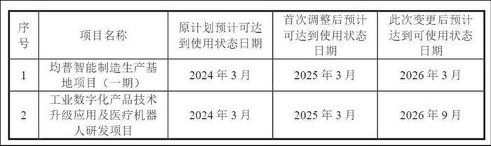 来源:公告相关公告显示,均普智能曾于2024年4月将“均普智能制造生产基地项目(一期)”与“工业数字化产品技术升级应用及医疗机器人研发项目”的达产时间延长至2025年3月;但仅一年后,2025年4月又再度延期,上述项目达产时间分别推迟至2026年3月与2026年9月,累计延期已超两年。