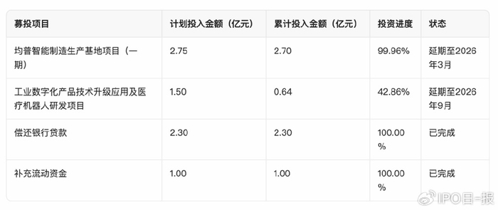 其中,生产基地项目(一期)投资进度为99.96%,计划延期至2026年3月;医疗机器人研发项目投资进度仅42.86%,计划延期至2026年9月。