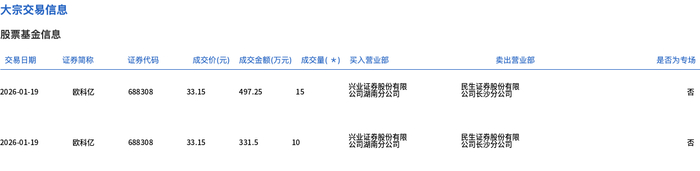 1月19日,欧科亿大宗交易成交25万股,成交额828.75万元,占当日总成交额的2.74%,成交价33.15元,较市场收盘价39.78元折价16.67%。