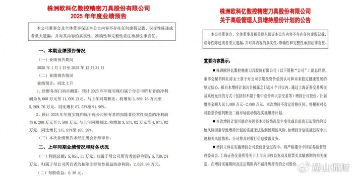 1月19日,株洲欧科亿数控精密刀具股份有限公司同日抛出高管增持与业绩预增两份重磅公告——猛药当即见效,20%的大长腿涨停。