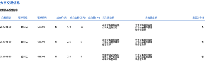1月30日,欧科亿大宗交易成交103万股,成交额4841万元,占当日总成交额的8.84%,成交价47元,较市场收盘价53.25元折价11.74%。