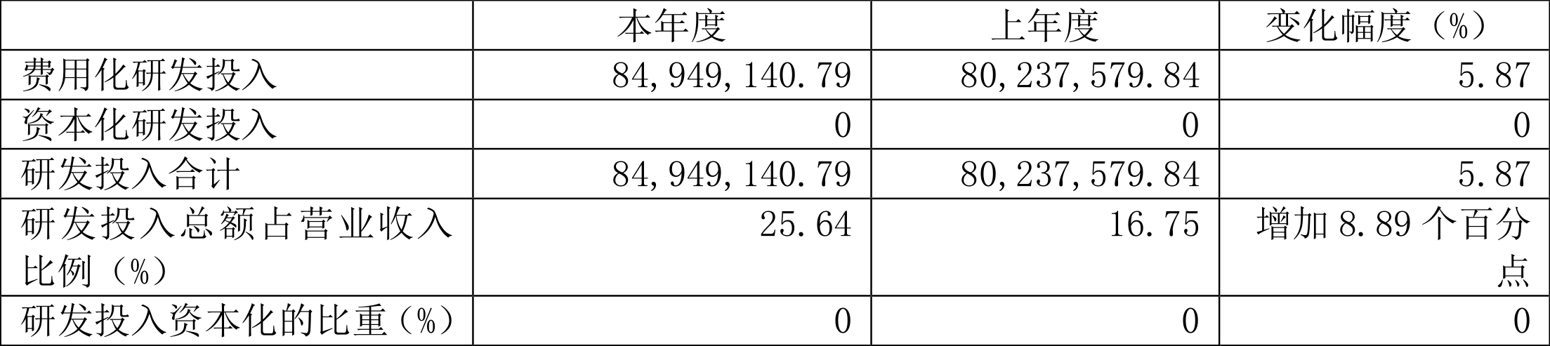 2023年全年,公司研发投入金额为8494.91万元,同比增长5.87%;研发投入占营业收入比例为25.64%,相比上年同期上升8.89个百分点。此外,公司全年研发投入资本化率为0。