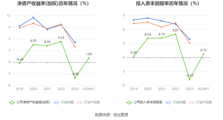 数据显示,2024年上半年公司加权平均净资产收益率为1.05%,较上年同期增长2.53个百分点;公司2024年上半年投入资本回报率为0.72%,较上年同期增长2.54个百分点。