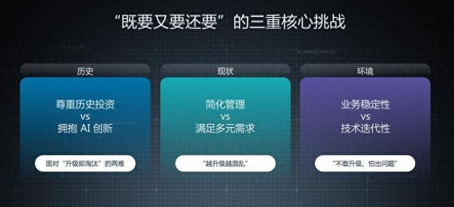 这并非易事,企业在数智化转型过程中,正深陷“既要又要还要”的三重核心挑战:其一,从历史维度看,既要尊重历史投资,又要主动拥抱AI创新,不得不直面“升级即淘汰”的两难境遇;其二,聚焦当下现状,技术团队既要简化管理,又要满足多元需求,进而导致IT越升级越混乱;其三,着眼大环境,企业既要保障业务稳定性,又要技术能够持续迭代升级,双重压力下,陷入“不敢升级、怕出问题”的困境。