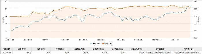 4月18日大宗交易成交358万股,成交额6189.82万元,占当日总成交额的61.56%,成交价17.29元,较市场收盘价21.11元折价18.1%。