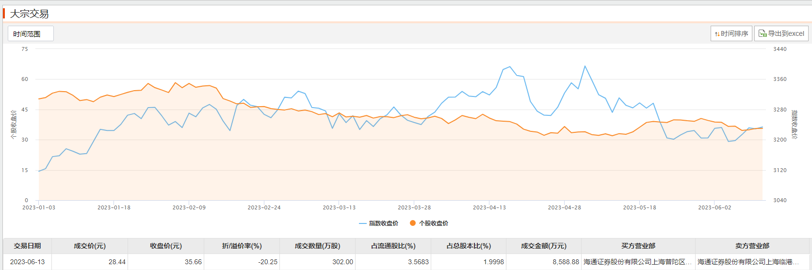 今日大宗交易成交302万股,成交额8588.88万元,占当日总成交额的61.93%,成交价28.44元,较市场收盘价折价20.25%。