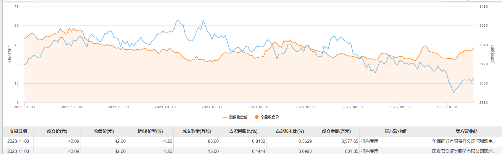 11月3日大宗交易成交100万股,成交额4209万元,占当日总成交额的7.46%,成交价42.09元,较市场收盘价折价1.2%。