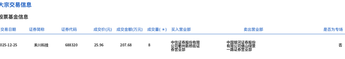 12月25日,禾川科技大宗交易成交8万股,成交额207.68万元,占当日总成交额的0.85%,成交价25.96元,较市场收盘价34.98元折价25.79%。