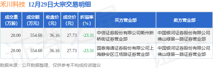 12月29日禾川科技现2笔折价23.31%的大宗交易 合计成交1109.2万元