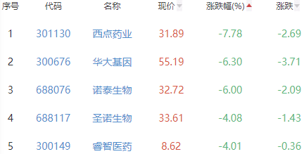 西点药业、华大基因、诺泰生物、圣诺生物和睿智医药位列涨幅榜后五位,涨幅分别为-7.78%、-6.30%、-6.00%、-4.08%和-4.01%。