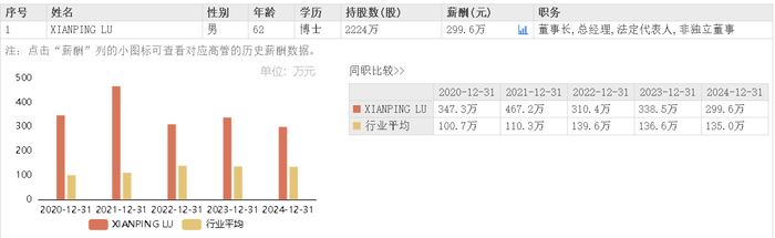 据东方财富网数据,微芯生物董事长兼总经理XIANPING LU(鲁先平)2024年所获薪酬为299.6万元,相较上年薪酬338.5万元降薪11.50%。