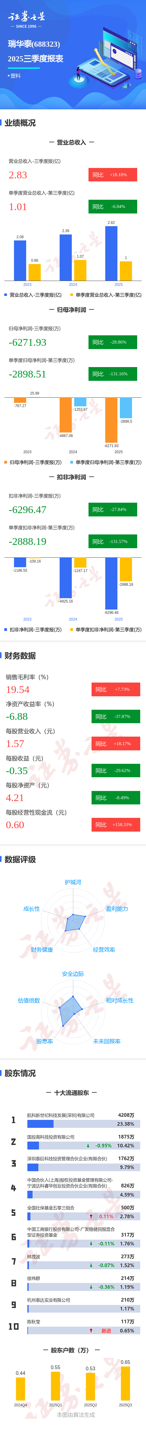 图解瑞华泰三季报:第三季度单季净利润同比下降131.16%