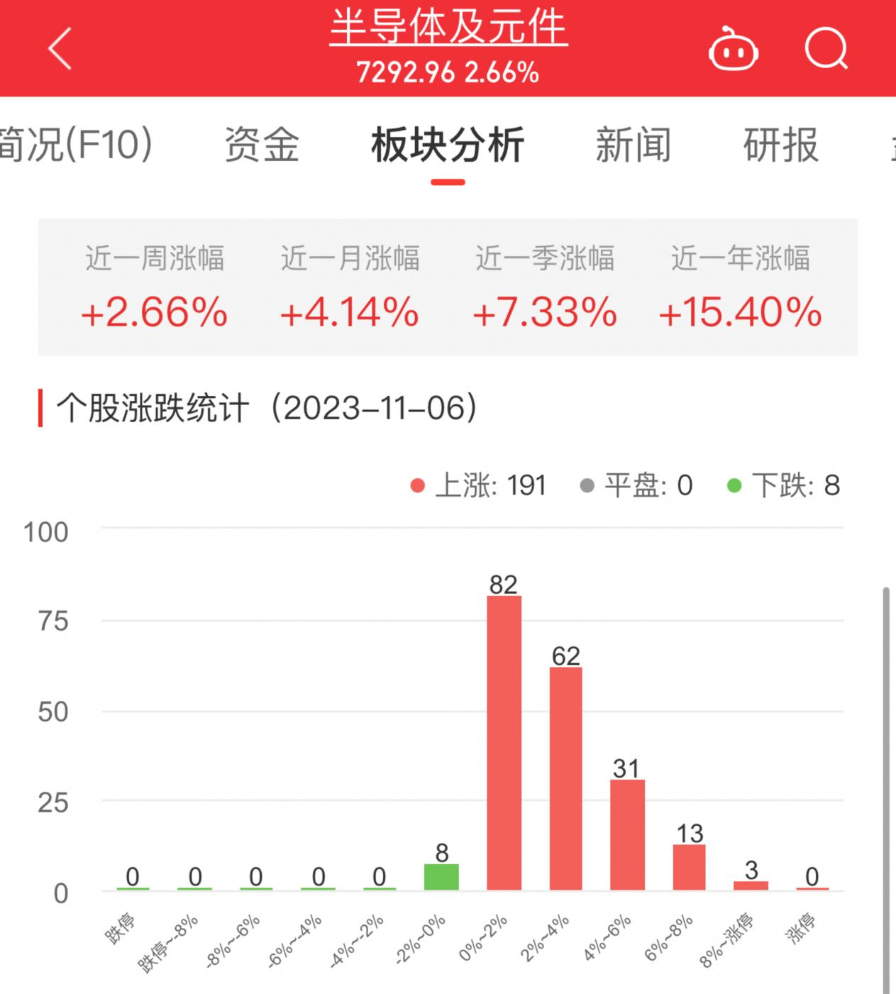中国经济网北京11月6日讯 今日,半导体及元件板块整体涨幅2.66%,其中191只股票上涨,8只股票下跌。