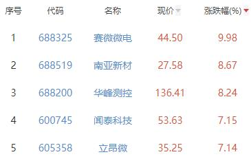 其中,赛微微电、南亚新材、华峰测控、闻泰科技(维权)、立昂微位列板块涨幅前五位,涨幅分别为9.98%、8.67%、8.24%、7.15%、7.14%。