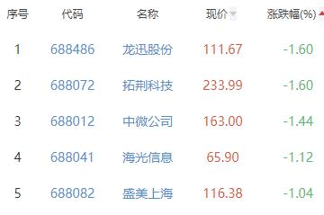 龙迅股份、拓荆科技、中微公司、海光信息、盛美上海位列涨幅榜后五位,涨幅分别为-1.60%、-1.60%、-1.44%、-1.12%、-1.04%。