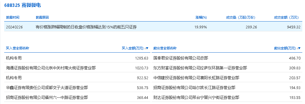 2月26日,赛微微电今日涨停,龙虎榜数据显示,上榜营业部席位全天成交5524.66万元,占当日总成交金额比例为58.4%。其中,买入金额为4136.08万元,卖出金额为1388.58万元,合计净买入2747.51万元。