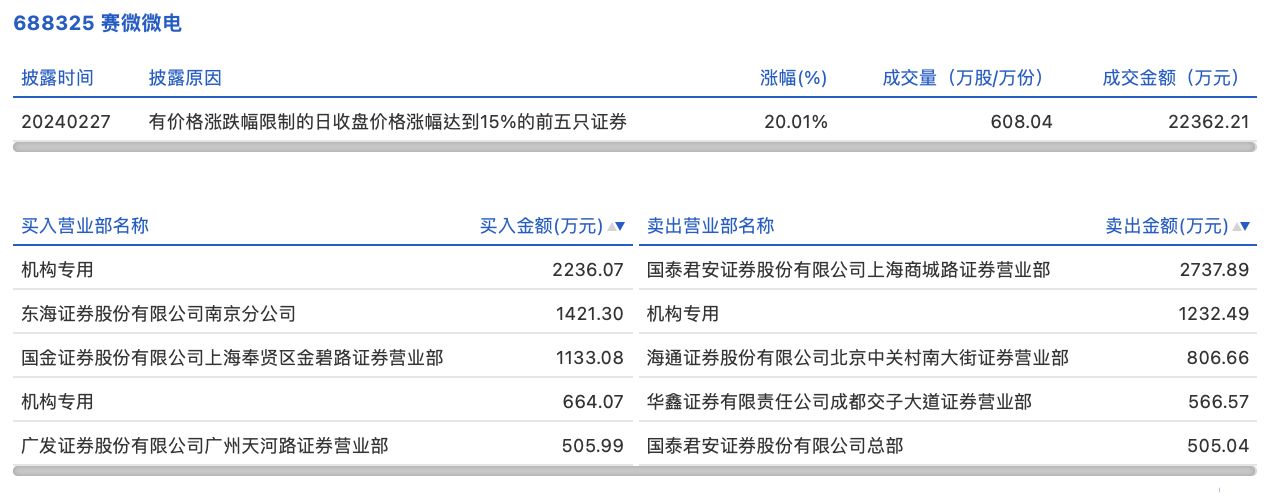2月27日,赛微微电今日涨停,龙虎榜数据显示,上榜营业部席位全天成交1.18亿元,占当日总成交金额比例为52.81%。其中,买入金额为5960.51万元,卖出金额为5848.64万元,合计净买入111.87万元。