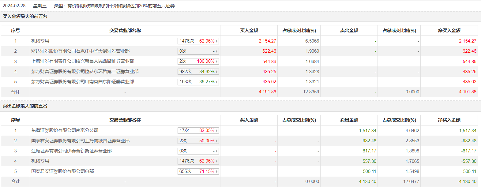 具体来看,机构买入2154.27万元,卖出557.3万元,合计净买入1596.96万元。此外,东海证券南京分公司、国泰君安证券上海商城路证券营业部分别卖出1517.34万元、932.48万元;财达证券石家庄中华大街证券营业部、上海证券绍兴新昌人民西路证券营业部分别买入622.46万元、544.86万元。