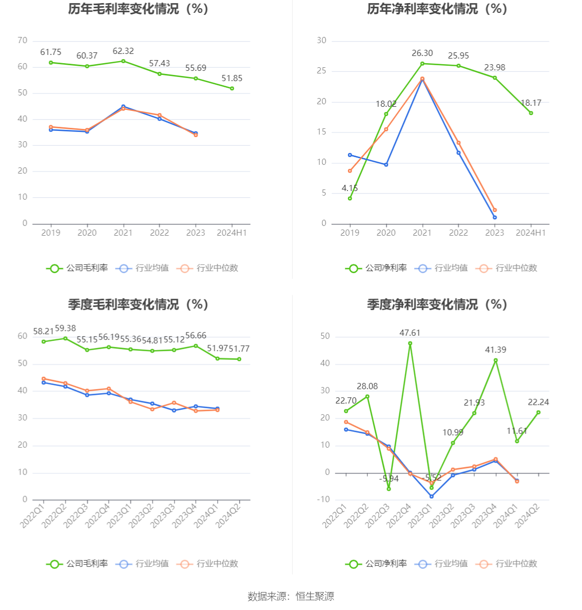 2024年上半年,公司毛利率为51.85%,同比下降3.15个百分点;净利率为18.17%,较上年同期上升12.81个百分点。从单季度指标来看,2024年第二季度公司毛利率为51.77%,同比下降3.04个百分点,环比下降0.20个百分点;净利率为22.24%,较上年同期上升11.25个百分点,较上一季度上升10.63个百分点。