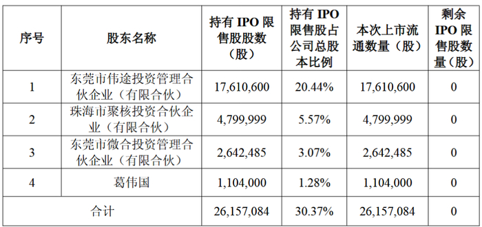 10月13日,赛微微电(688325)发布公告,公司4名股东合计所持2616万股首发限售股份将于2025年10月22日上市流通,明细清单如下:
