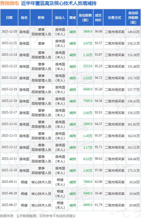 赛微微电近半年内的董监高及核心技术人员增减持详情如下:
