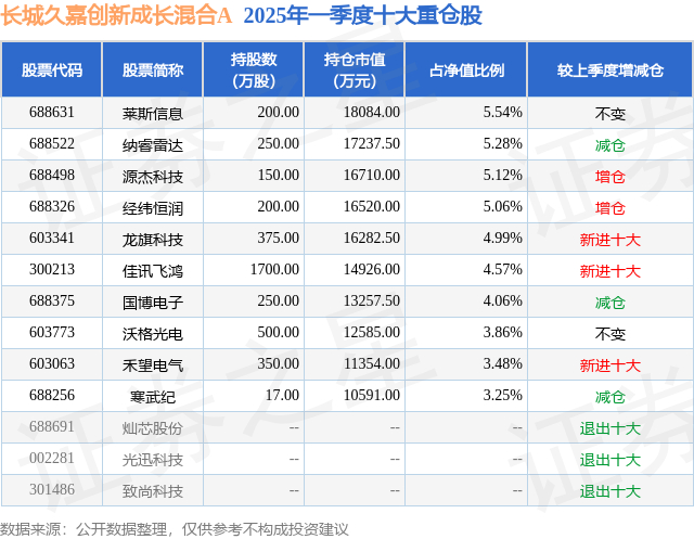 根据2025基金Q1季报公募基金重仓股数据,重仓该股的公募基金共4家,其中持有数量最多的公募基金为长城基金的长城久嘉创新成长混合A。长城久嘉创新成长混合A目前规模为18.55亿元,最新净值1.6876(5月15日),较上一交易日下跌2.09%,近一年上涨23.61%。该公募基金现任基金经理为尤国梁。尤国梁在任的基金产品包括:长城景气成长混合A,管理时间为2023年9月12日至今,期间收益率为12.31%。