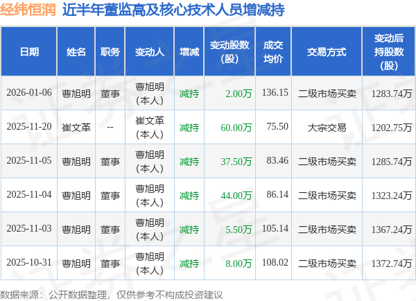 证券之星消息,根据1月7日市场公开信息、上市公司公告及交易所披露数据整理,经纬恒润(688326)最新董监高及相关人员股份变动情况:2026年1月6日公司董事曹旭明共减持公司股份2.0万股,占公司总股本为0.0167%。变动期间公司股价上涨8.0%,1月6日当日收盘报134.23元。
