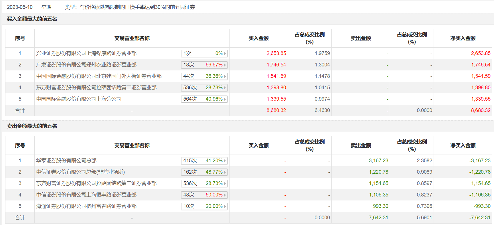具体来看,兴业证券上海锦康路证券营业部、广发证券郑州农业路证券营业部分别买入2653.85万元、1746.54万元;华泰证券总部、中信证券总部(非营业场所)分别卖出3167.23万元、1220.78万元。
