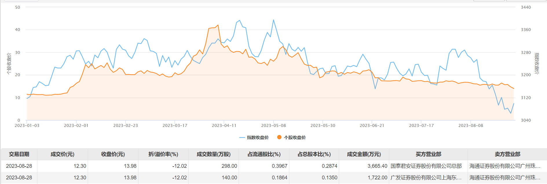 -UW8月28日大宗交易成交438万股,成交额5387.4万元,占当日总成交额的9.62%,成交价12.3元,较市场收盘价13.98元折价12.02%。