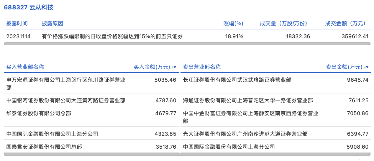 11月14日,云从科技-UW今日涨18.91%,全天换手率达24.56%,振幅达17.5%。龙虎榜数据显示,营业部席位合计净卖出1.43亿元。其中,申万宏源证券有限公司上海闵行区东川路证券营业部、中国银河证券大连黄河路证券营业部分别买入5035.46万元、4787.60万元;长江证券武汉武珞路证券营业部、海通证券上海普陀区大华一路证券营业部分别卖出9648.74万元、7611.25万元。
