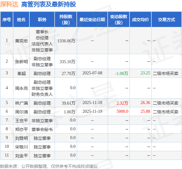 深科达近半年内的董监高及核心技术人员增减持详情如下: