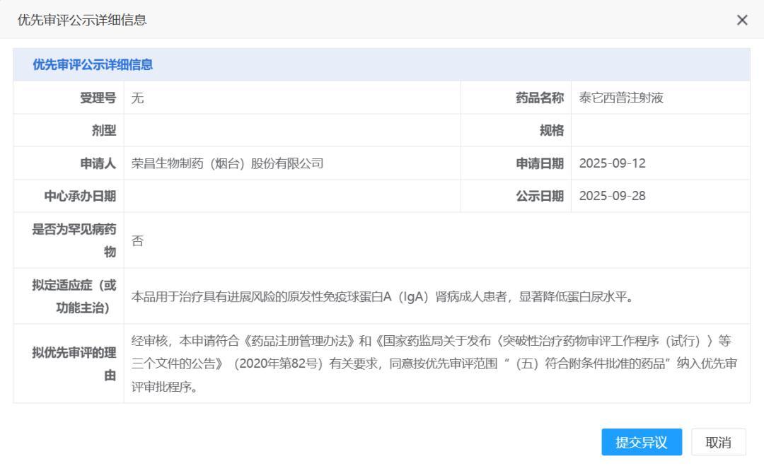 2025年8月,荣昌生物宣布泰它西普治疗IgA肾病的国内Ⅲ期研究达成A阶段主要终点。研究结果显示,与安慰剂组相比,泰它西普组患者在治疗39周时24小时尿蛋白肌酐比值(UPCR)降低了55%(P<0.0001),且表现出良好的耐受性和安全性。9月28日,泰它西普拟纳入优先审评品种,加速了药物上市进程。