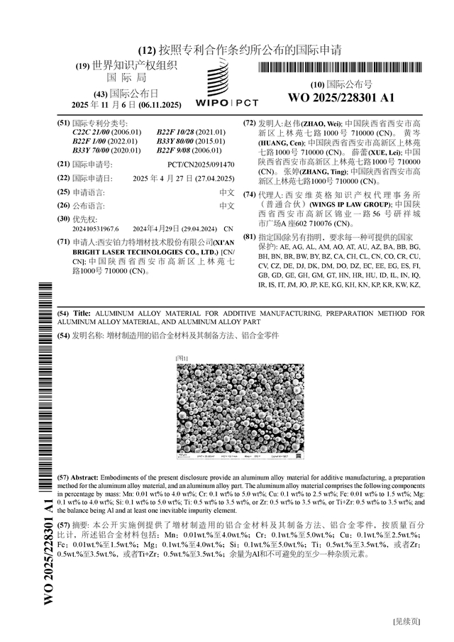 铂力特公布国际专利申请:“增材制造用的铝合金材料及其制备方法、铝合金零件”