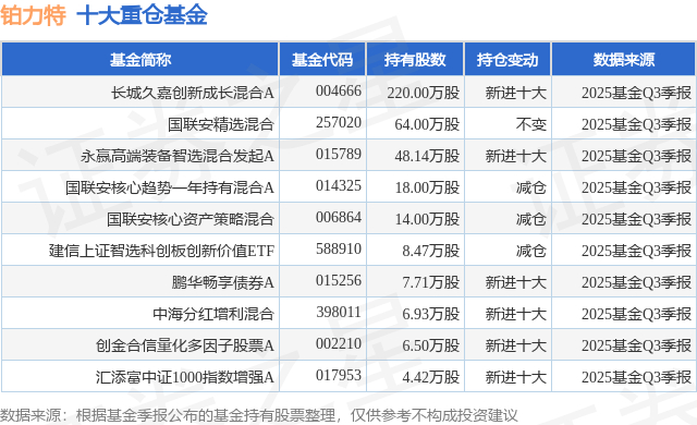 根据2025基金Q3季报公募基金重仓股数据,重仓该股的公募基金共18家,其中持有数量最多的公募基金为长城基金的长城久嘉创新成长混合A。长城久嘉创新成长混合A目前规模为19.74亿元,最新净值2.1544(11月20日),较上一交易日上涨0.13%,近一年上涨26.25%。该公募基金现任基金经理为尤国梁。尤国梁在任的基金产品包括:长城景气成长混合A,管理时间为2023年9月12日至今,期间收益率为27.93%。