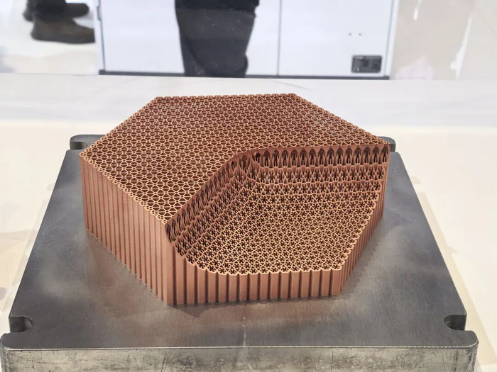 铂力特展示了由搭载绿光激光器的BLT-S310打印的纯铜散热器,部件尺寸为190mm×190mm×50mm,重量达3.14kg。