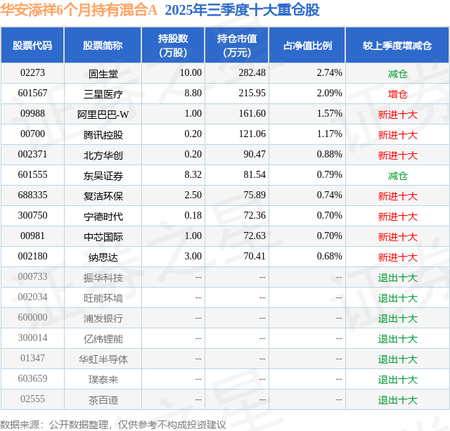 华安添祥6个月持有混合A的前十大重仓股如下: