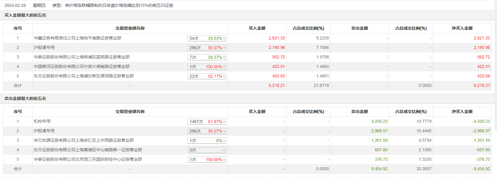 2月29日,亿华通-U今日涨停,龙虎榜数据显示,上榜营业部席位全天成交1.57亿元,占当日总成交金额比例为55.14%。其中,买入金额为6218.2万元,卖出金额为9454.92万元,合计净卖出3236.72万元。