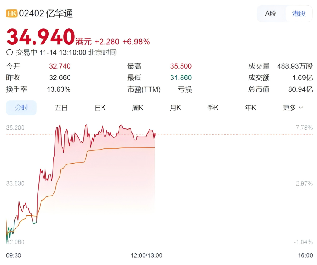 2025年11月14日,亿华通港股(02402.HK)今日股价表现亮眼,一度涨超7%,截至午盘发稿时涨幅达6.797%,报34.88港元,成交额1.676亿港元。亿华通A股涨超8%。这波上涨行情直接受到公司在2025东京车展(又称日本移动出行展)上技术突破的推动。