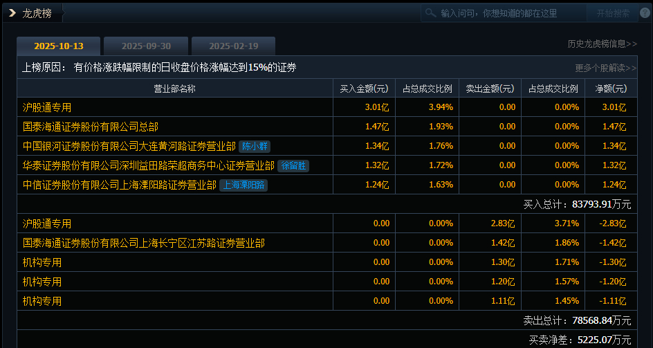华虹公司今日20cm涨停,成交额76.26亿元,换手率15.00%,盘后龙虎榜数据显示,沪股通专用席位买入3.01亿元并卖出2.83亿元,有3家机构专用席位净卖出3.61亿元。陈小群席位净买入1.34亿元。徐留胜席位净买入1.32亿元。